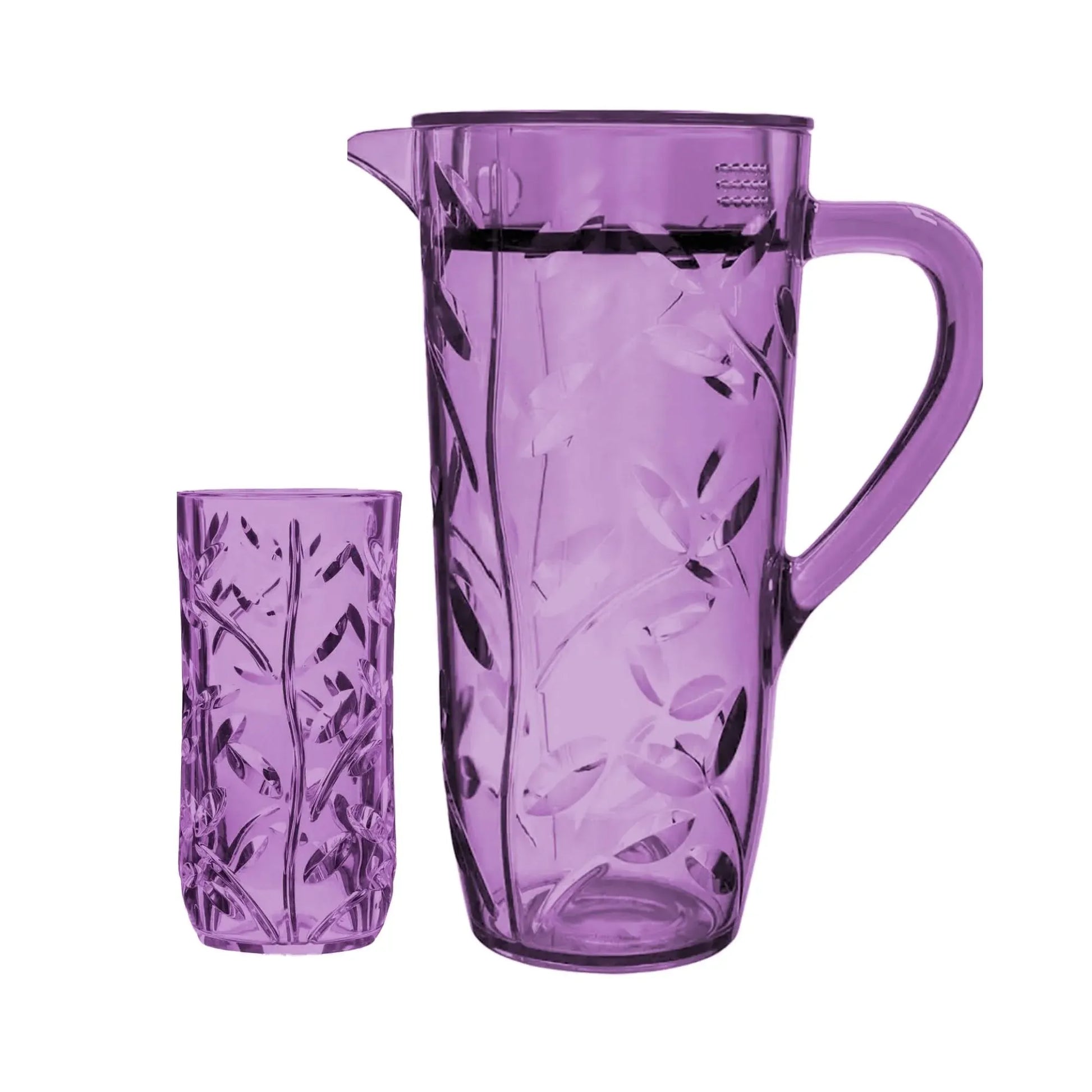 The Acrylic Leaves Cut Water SetProduct Overview: The Acrylic Leaves Cut Water Set is a sophisticated and practical addition to your dining experience. This 7-piece set includes Highball (HB) glasses, perfect for serving water or your favorite beverages, along with a 1.8-liter jug. Color Options: Express your style with our range of color options. Choose from Transparent, Blue, Pink, Purple, Light Blue, Smoke, Yellow, Brown, Dark Purple, or Violet Purple to match your preferences and enhance your table setting. |